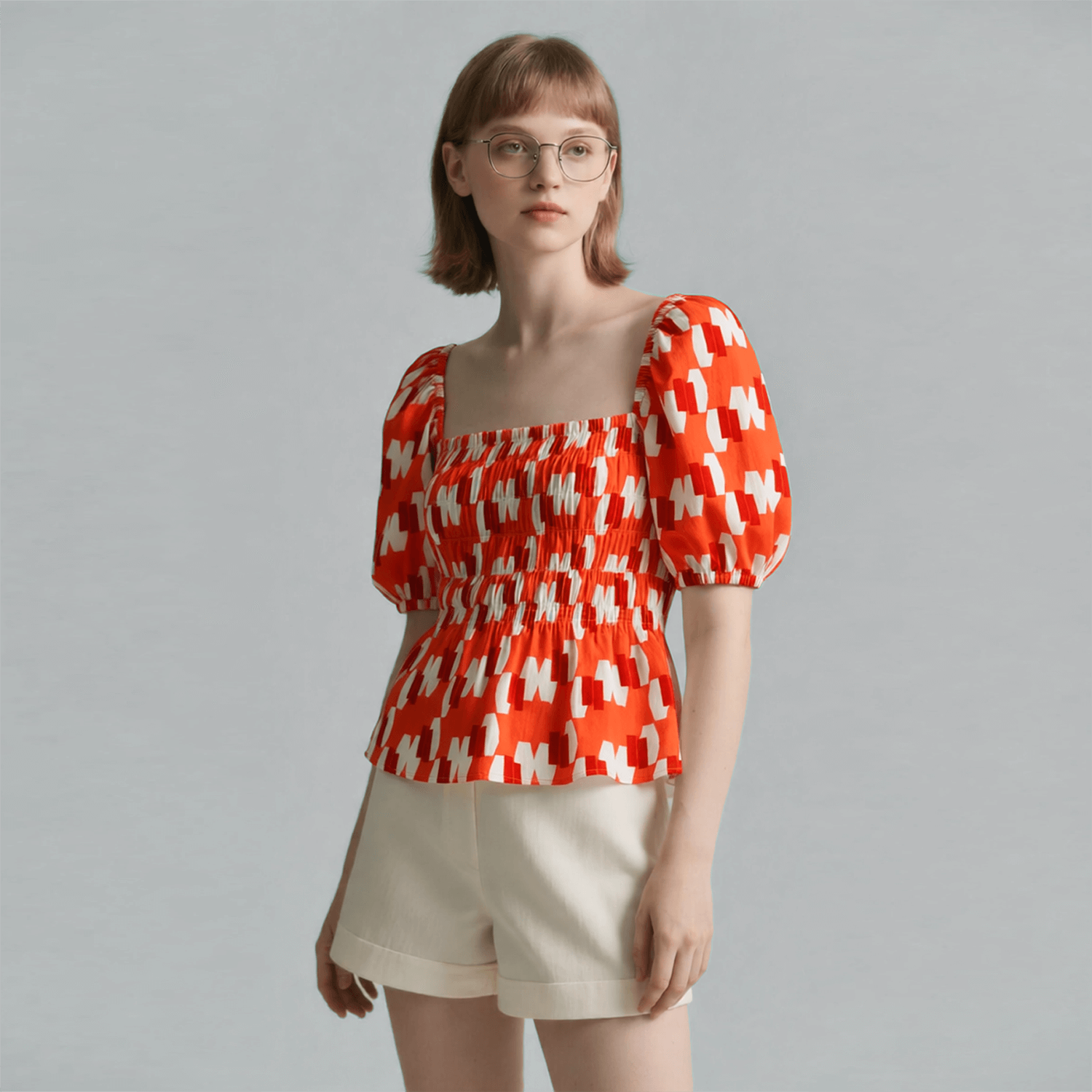 This polyester fabric features a geometric print with regular finishing, offering a modern and eye-catching design. Suitable for various apparel applications, it is durable, easy to care for, and adds visual interest to garments.